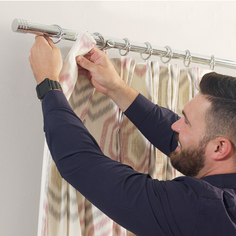 - Pencil pleat curtains: Reinsert the curtain hooks into the sewn pleats, ensuring each is evenly spaced, then attach them to the curtain rings or gliders. Using the adjustable slider, hang and adjust so the pleats fall neatly and evenly.