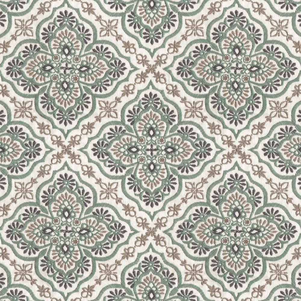 A vibrant, modern fabric with a moroccan tiled design in a warm colour palette. Havana – Jade adds fun touches to your living spaces.
