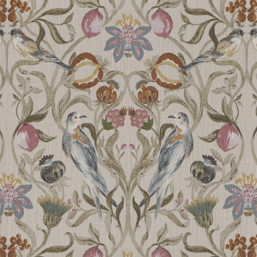 This gorgeous print from Edinburgh Weavers has flowers, birds, leaves and fruit printed on a linen look fabric.